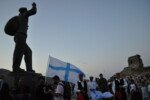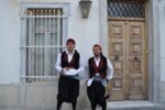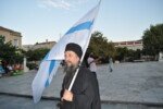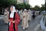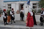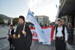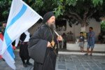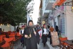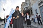 Η πομπή με παραδοσιακές φορεσιές ξεκίνησε από το Ανοικτό Θέατρο, ο μοναχός Αέτιος κρατώντας το λάβαρο της Επανάστασης, συνοδεία μουσικής και παραδοσιακών οργάνων τους Αμορόζα / Amoroza Ensemble διέσχισε την αγορά με τελικό προορισμό την πλατεία Αφανούς Ναύτου.