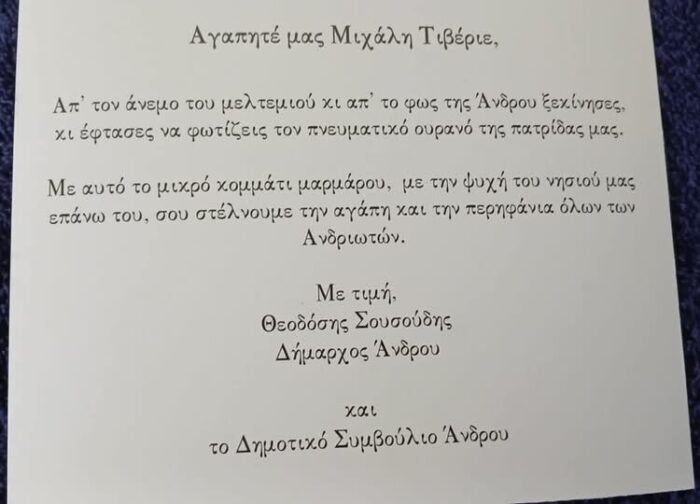 Δραττόμενος της ευκαιρίας ο δήμος Άνδρου τίμησε με αναμνηστική πλακέτα σε λευκό πεντελικό μάρμαρο τον πρόεδρο της Ακαδημίας Αθηνών Μιχάλη Τιβέριο εκφράζοντας την τιμή και την συγκίνηση που διακατέχει κάθε Ανδριώτη για τον Ανδριώτη πρόεδρο της Ακαδημίας Αθηνών.