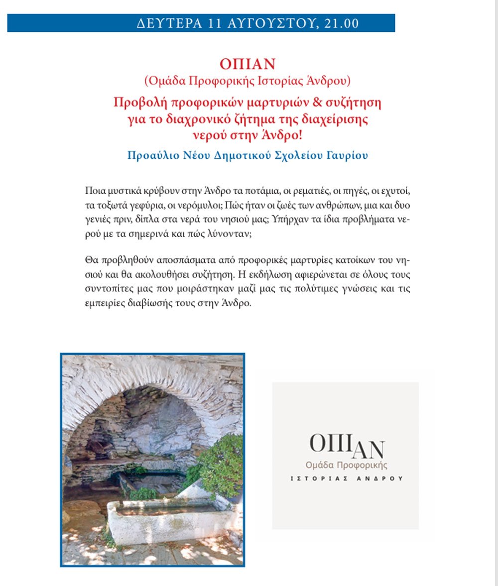 Ο Φ.Ο.Γ. βάζει το δικό του λιθαράκι στην ιστορία και στην καθημερινή πρακτική. Η ΟΠΙΑΝ “μιλά” για το νερό στα Γαυριώτικα. Έναν θεσμό που “ιδρύθηκε” από τον Φιλοπρόοδο Όμιλο “Το Γαύριο” και στηρίζεται εδώ και δεκαετίες από τους Γαυριώτες.