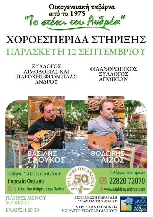 Την Παρασκευή 12 Σεπτεμβρίου στις 8.30 το βράδυ στη ταβέρνα ‘’ Το Στέκι του Ανδρέα’’ στη παραλία Φελλού στην Άνδρο, θα είμαστε όλοι εκεί.
