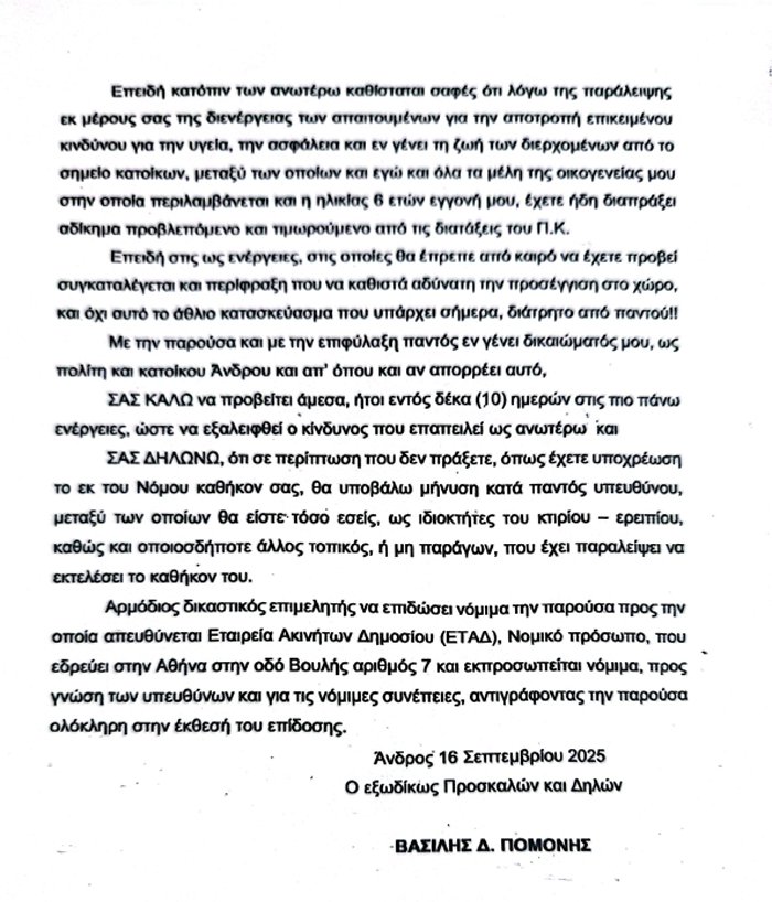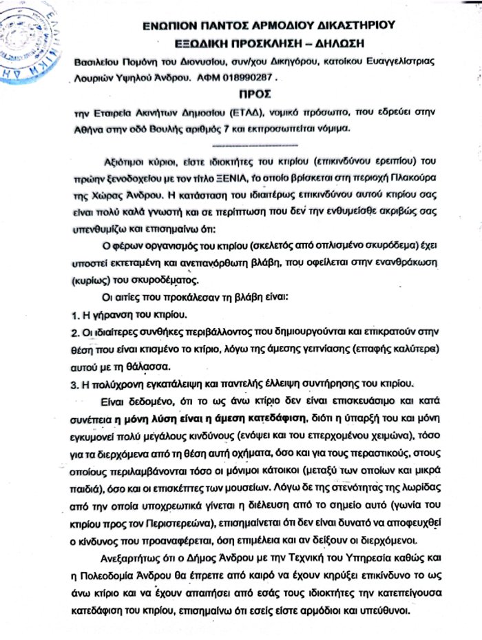 Το απολίθωμα του πάλαι ποτέ “ένδοξου” Xenia “όπλισε” τον δικηγόρο Άνδρου κ. Βασίλη Πομόνη ο οποίος ανέλαβε δράση, επισημαίνοντας την επικινδυνότητα του κτηρίου που βρίσκεται υπό κατάρρευση στους αρμόδιους ιδιοκτήτες -όπως σαφώς αναφέρεται στο κείμενο- δηλαδή στην Εταιρεία Ακινήτων Δημοσίου με εξώδικη πρόσκληση – δήλωση η οποία επιδόθηκε στις 17 Σεπτεμβρίου 2025 στην ΕΤΑΔ.