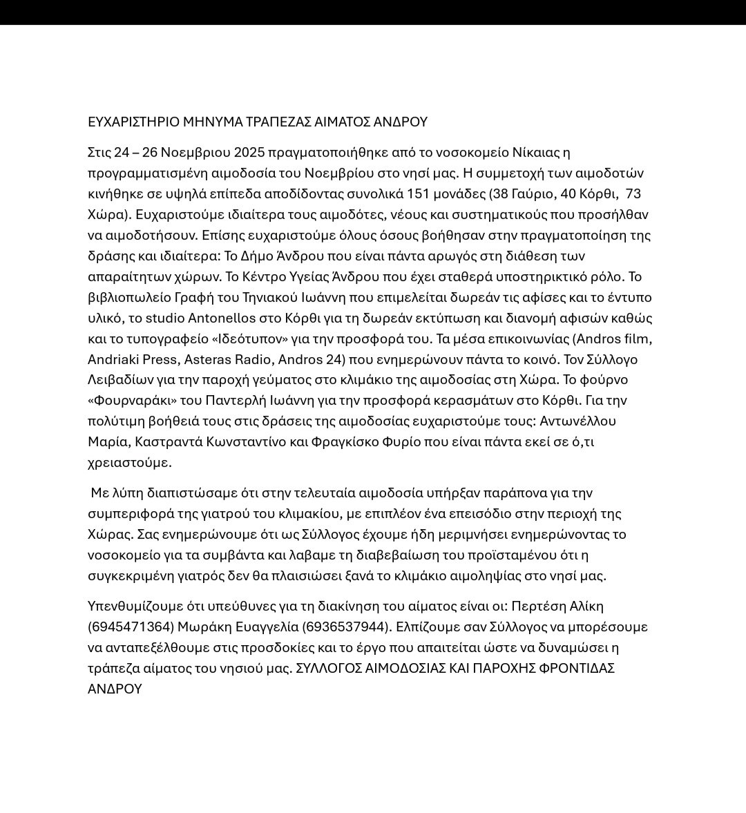 ΕπικαιροτηταΚοινωνια Τα 5 λεπτά αρκούν για μια ζωή Από Ανδριακή Press - 08/12/2025 FacebookTwitterWhatsAppLinkedinEmailPrintTelegramViberCopy URL ΠΑΡΟΜΟΙΑ ΑΡΘΡΑΠΕΡΙΣΣΟΤΕΡΑ.... Αυτοδιοικηση Δείτε την ειδική συνεδρίαση λογοδοσίας της δημοτικής αρχής Κοινωνια Αθηνά Σχινά και Γιάννης Μαμάης βραβεύτηκαν από την Ακαδημία Αθηνών Εκδηλωσεις Ύμνους Υφαίνειν ΑΦΗΣΤΕ ΕΝΑ ΣΧΟΛΙΟ Ακύρωση απάντησηςΗ andriakipress.gr δημοσιεύει κάθε σχόλιο το οποίο είναι σχετικό με το θέμα. Ωστόσο, αυτό δεν σημαίνει ότι υιοθετεί τις απόψεις αυτές. Διατηρεί το δικαίωμα να μην δημοσιεύει συκοφαντικά, υβριστικά, ρατσιστικά ή άλλα σχόλια που προτρέπουν σε άσκηση βίας. Επίσης, σχόλια σε greeklish και κεφαλαία δεν θα δημοσιεύονται, ενώ η andriakipress.gr, όταν και όπου κρίνει, θα συμμετέχει στον διάλογο. εισάγετε το σχόλιό σας! παρακαλώ εισάγετε το όνομά σας εδώ έχετε εισάγει εσφαλμένη διεύθυνση ηλεκτρονικού ταχυδρομείου! παρακαλώ εισάγετε εδώ την ηλεκτρονική σας διεύθυνση αποθηκεύστε το όνομα, το ηλεκτρονικό ταχυδρομείο και τον ιστότοπό μου σε αυτό το πρόγραμμα περιήγησης για την επόμενη φορά που θα σχολιάσω. Δ This site uses Akismet to reduce spam. Learn how your comment data is processed.