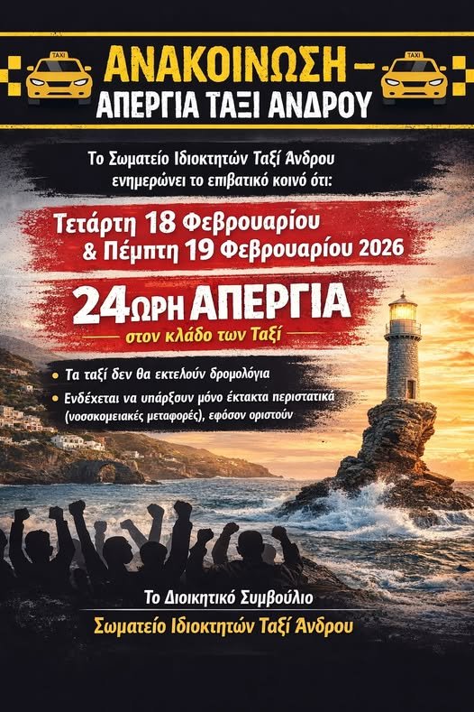 Μόνο έκτακτα περιστατικά εξυπηρετούν τα TAXI Άνδρου το διήμερο 18 και 19 Φεβρουαρίου καθώς το Σωματείο Ιδιοκτητών του νησιού συμμετέχει στις πανελλαδικές κινητοποιήσεις του κλάδου.