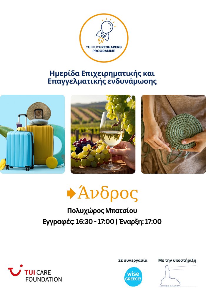 Η Wise Greece, με την υποστήριξη του TUI Care Foundation και σε συνεργασία με τον Δήμο Άνδρου, διοργανώνουν Ημερίδα Επιχειρηματικής και Επαγγελματικής Ενδυνάμωσης – μια μοναδική ευκαιρία για επαγγελματίες ή επιχειρηματίες να ενισχύσουν τις γνώσεις και τις δεξιότητές τους στον Πολυχώρο του Μπατσίου στις 12 Μαρτίου 2026.
