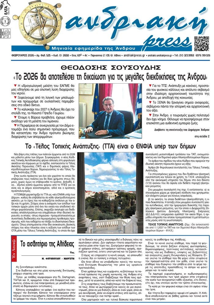 *Συνέντευξη με τον δήμαρχο Άνδρου, Θεοδόση Σουσούδη. Τι λέει για το νερό, το οδικό δίκτυο, το Κλειστό Γήπεδο Γαυρίου, τα λιμάνια, τη διαχείριση των απορριμμάτων, το Τοπικό Πολεοδομικό Σχέδιο, το Ξενία, τον τουρισμό και τον πολιτισμό.