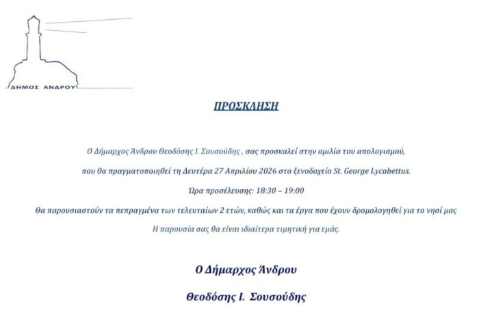 ​Σας προσκαλώ την Δευτέρα 27 Απριλίου 2026, στο ξενοδοχείο St. George Lycabettus (Αθήνα), στην παρουσίαση του απολογισμού τουεργου μας, για τους ετεροδημότες και όλους τους φίλους του νησιού μας που ζουν στην πρωτεύουσα.