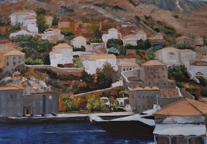 Αν υπάρχει μια εικόνα που μεταφέρει τον έρωτα για έναν τόπο, για όλα τα συστατικά του, την μυρωδιά των δέντρων την Άνοιξη, το ασταμάτητο θρόισμα των κυμάτων, το χάδι του αέρα πάνω στα βράχια, τα χρώματα των δειλινών, τα μισόκλειστα παράθυρα, αυτή είναι η εικόνα της ζωγραφικής της Κατερίνας που υμνεί το νησί που τόσο αγαπά. Δεν πρόκειται για απλές μεταφορές φωτογραφικού τύπου στον καμβά, είναι μια συνύπαρξη υλικού και μνήμης, ελαι- ογραφίες με κοφτές πινελιές, χωρίς ωραιοποίηση διότι το τοπίο δεν φοβάται την πραγματικότητα.