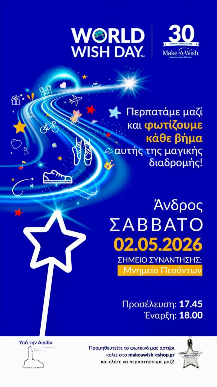 Ο Δήμος Άνδρου με χαρά στηρίζει και συμμετέχει στην πανελλαδική δράση «Walk for Wishes 2026», που διοργανώνεται με αφορμή την Παγκόσμια Ημέρα Ευχής. Η εκδήλωση θα πραγματοποιηθεί το Σάββατο 2 Μαΐου 2026 και ώρα 17:45, με σημείο συγκέντρωσης το Μνημείο Πεσόντων στο Γαύριο.