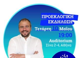 Σας προσκαλώ στην προεκλογική εκδήλωσή μου, την Τετάρτη 10 Μαΐου στις 19:00 στην αίθουσα Auditorium, Σίνα 2-4, στο κέντρο της Αθήνας.